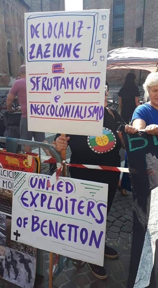 Azione di protesta davanti al negozio di BENETTON e all’entrata della Biennale di Venezia. “Un regalo di Benetton” è l’immagine insanguinata di SANTIAGO MALDONADO, assassinato dalle forze repressive dello stato argentino all’ordine delle multinazionali, tra cui quella italiana, che da anni stanno saccheggiando i territori ancestrali del popolo Mapuche, criminalizzando e assassinando un popolo che difende la propria terra, cultura e dignitá.